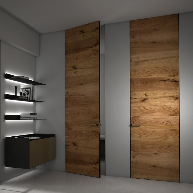 - Модификация межкомнатных дверей на любой вкус – добавление ручки в цвет алюминиевого профиля, вставки в ручке в материале полотна, использование усиленных скрытых петель, регулируемых в трех плоскостях.